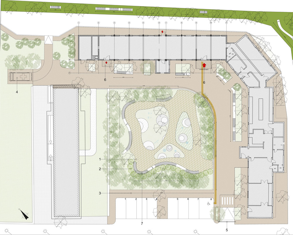Επίσης θα περιλαμβάνει παρεμβάσεις στον άμεσο Περιβάλλοντα χώρο, ώστε να εξυπηρετεί λειτουργικά τις χρήσεις του κτιρίου και να διαθέτει υπαίθριους χώρους εκτόνωσης και προσωρινής παραμονής των χρηστών.